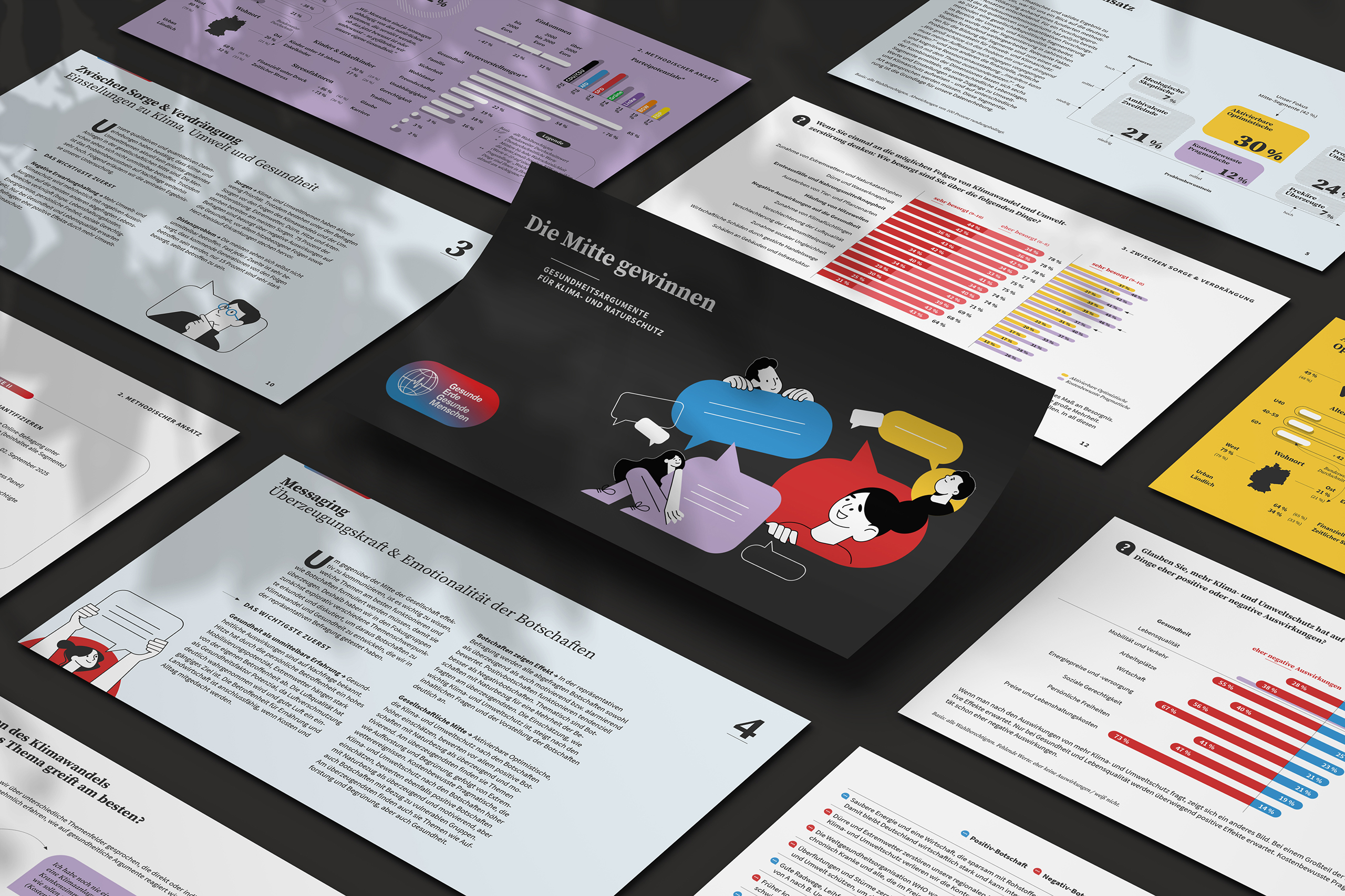 Die Gestaltung übersetzt qualitative und quantitative Forschungsergebnisse in eine präzise, zugängliche Bildsprache und macht gesundheitliche Argumente als wirkungsvolle Brücke zwischen Klima- und Umweltschutz und der gesellschaftlichen Mitte nachvollziehbar und anschlussfähig. Die Studie wurde sowohl als Printversion als auch als digitale Präsentation umgesetzt.